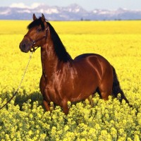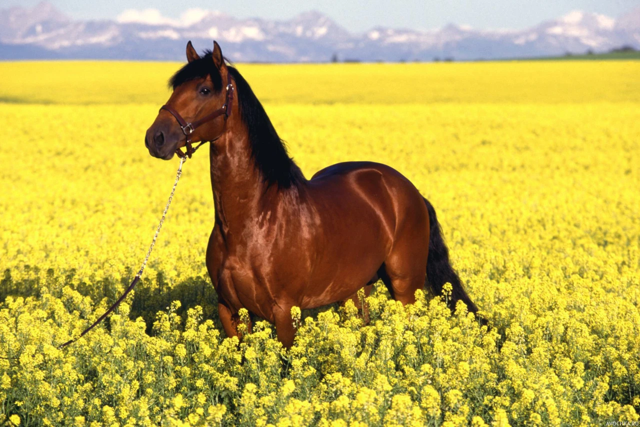 Фото с лошадью породы мустанг в поле с цветами. На фото изображено красивое поле, усеянное желтыми цветами, в которых стоит прекрасный грациозный конь мустанг гнедой масти. Скачать фото с лошадью в цветочном поле.