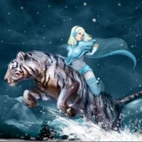Картинка в стиле аниме с девушкой на белом тигре. Картинка с девушкой на тигре подойдет на аву в контакте любителям аниме. На рисунке изображена девушка в синем костюме и шапке-наушниках, мчащаяся на белом тигре в пургу и метель. Скачать картинку в стиле аниме на аву.