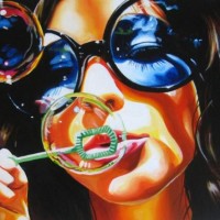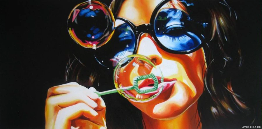 Картинка с девушкой в очках. На фото девушка в больших круглых синих очках пускает мыльные пузыри. Скачать картинку с девушкой в очках, пускающую мыльные пузыри.