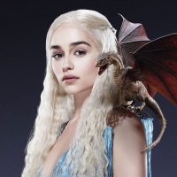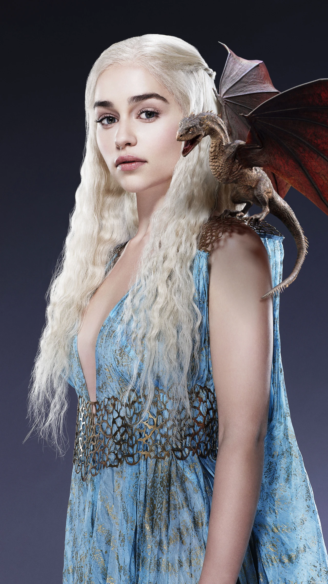 Картинка с одной из главных героинь сериала Игра Престолов. Очаровательная Дейнерис со светлыми серебристыми волосами и фиолетовым цветом глаз держит маленького дракона на плече. Если вам нравится сериал Игра Престолов, то вы наверняка захотите скачать картинку с Дейнерис себе для коллекции.