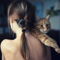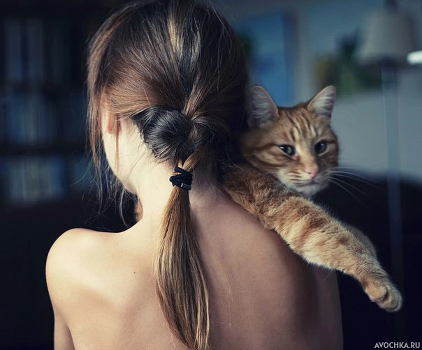 Фото с девушкой спиной с котом на руках. На картинке обнаженная девушка со спины, держащая на плече рыжего кота. Фото с девушкой косичкой со спины можно установить на аву в контакте или другой социальной сети.