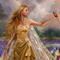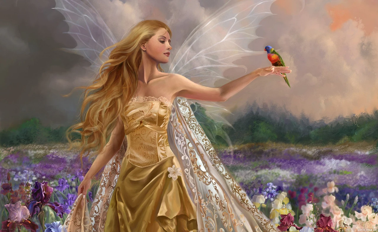 На рисунке изображена красивая девушка с длинными волнистыми волосами в нарядном золотистом платье, а за спиной ее растут крылья бабочки. На расстоянии вытянутой руки у девушки сидит птица. Картинка с девушкой в поле с цветами можно скачать на аву прямо здесь и сейчас бесплатно на этом сайте.