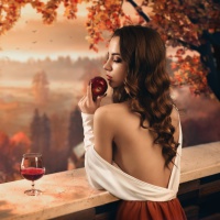 Фото с девушкой с яблоком, стоящей спиной. На фото девушка спиной стоит на балконе и держит в руке яблоко. Рядом с девушкой стоит бокал вина, а сама она стоит, обнажив спину в легкой белой кофточке и ее взгляд падает на этот благородный напиток. Скачать фото с девушкой со спины на аву в контакте.