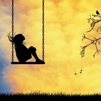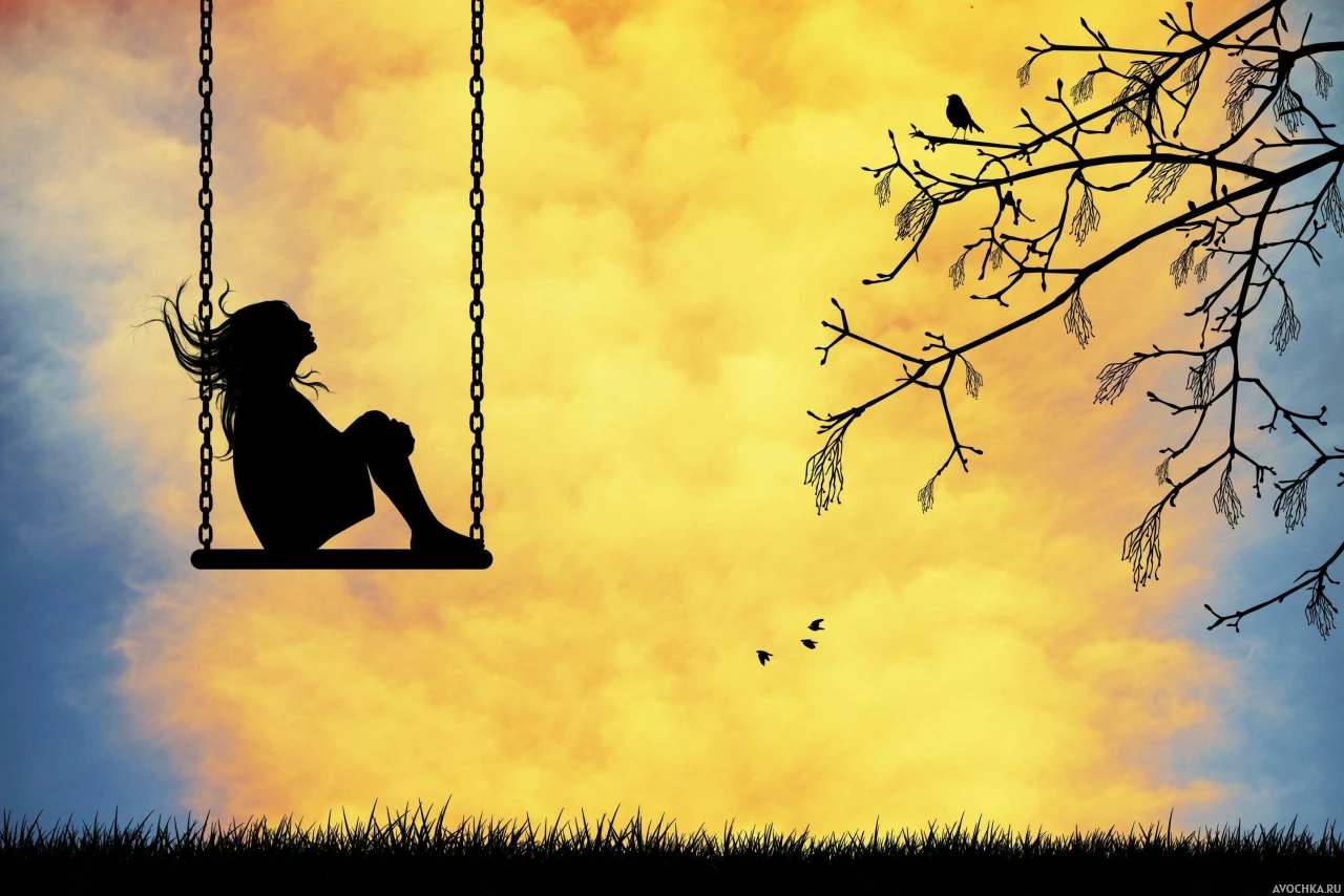 Силуэт с девочкой, сидящей на качелях. На картинке изображена девочка, которая сидит на качелях и смотрит на птицу на дереве. Катание на качелях - прекрасный способ вернуться в детство и повспоминать приятные моменты беззаботного времени. Скачать картинку с силуэтом девочки на качелях.