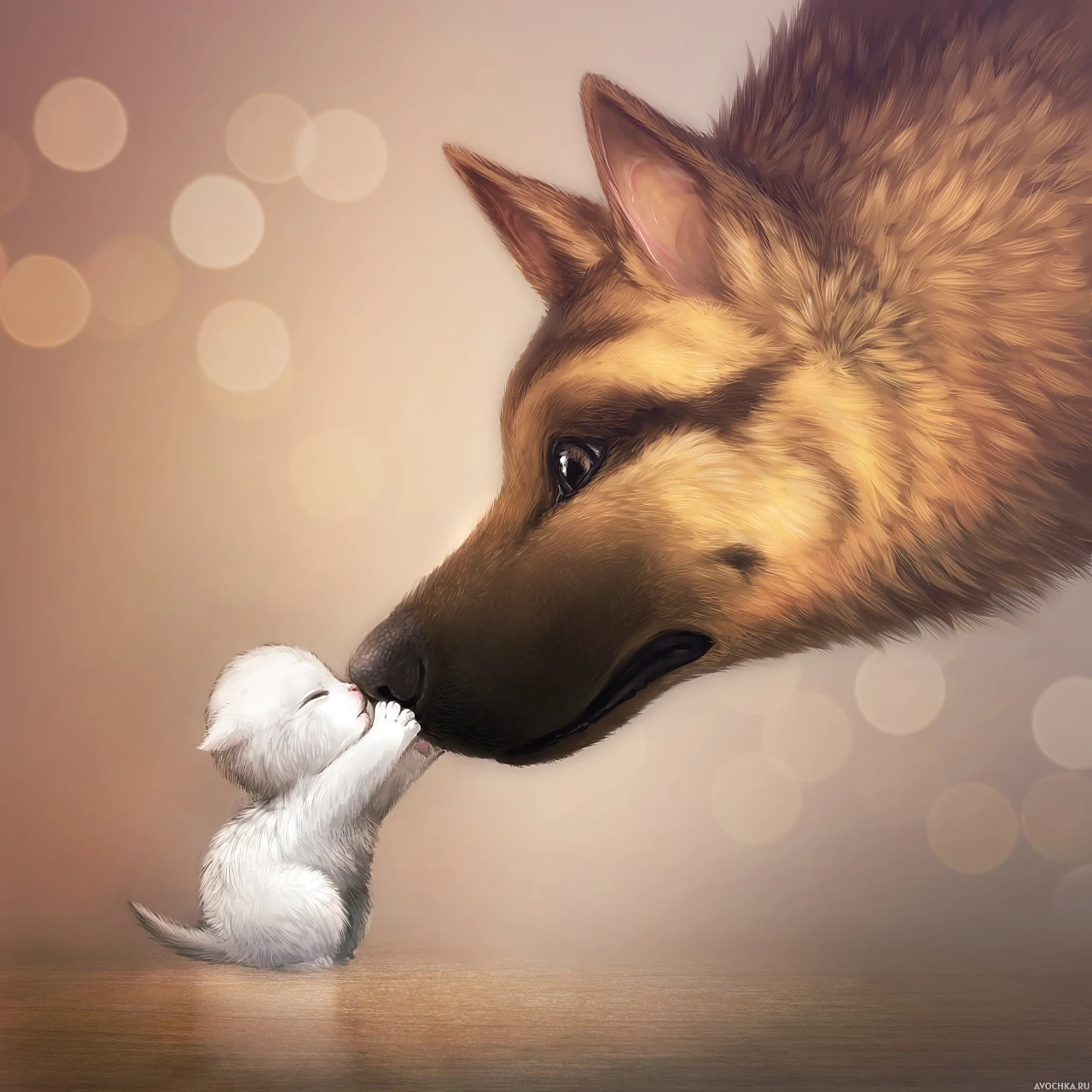 Рисунок с собакой и котенком. На фото изображен замечательный рисунок с собакой и маленьким котенком. Рисунок отображает дружбу между совершенно разными животными - кошкой и собакой. Скачать рисунок с кошкой и собакой н аву.