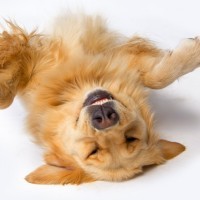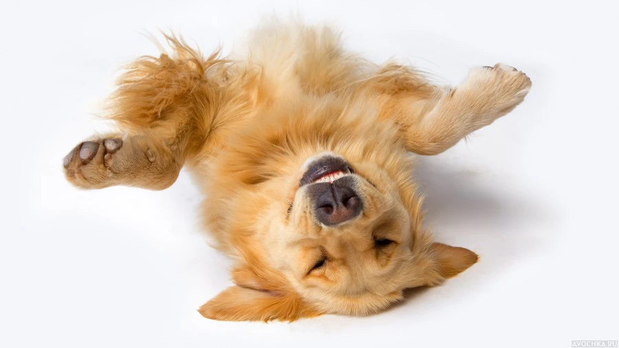 Забавный золотистый ретривер на спине. На картинке изображен прикольный пёс породы "золотистый ретривер", который валяется на спине. Животные - удивительные и смешные существа, которые постоянно нас радуют своими действиями. За ними прикольно наблюдать даже тогда, когда они просто валяются и отдыхают. Скачать картинку с золотистым ретривером, валяющимся на спине.