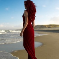 Фото с девушкой со спины с красными волосами и в красном платье. На картинке девушка с огненно-красными волосами стоит спиной в длинном красивом платье на берегу моря. Скачать картинку с девушкой со спины в красном платье.