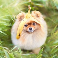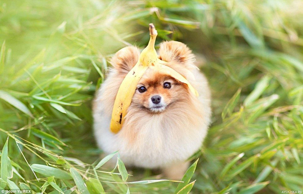 Забавная картинка с померанским шпицем с кожуркой банана на голове
