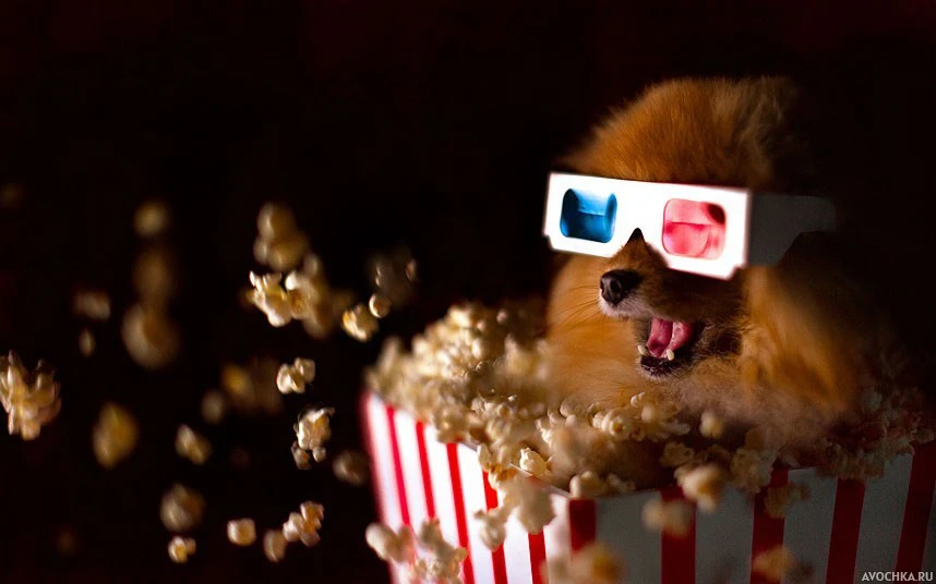 Прикольный пёс породы померанский шпиц в 3д очках. На картинке изображен счастливый и довольный пёс в 3д очках, сидящий в миске с поп корном. Развлекаться и весело проводить досуг могут не только люди, но и собаки, посещая собачий кинотеатр. Скачать фото со шпицем с поп корном.