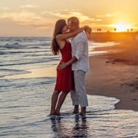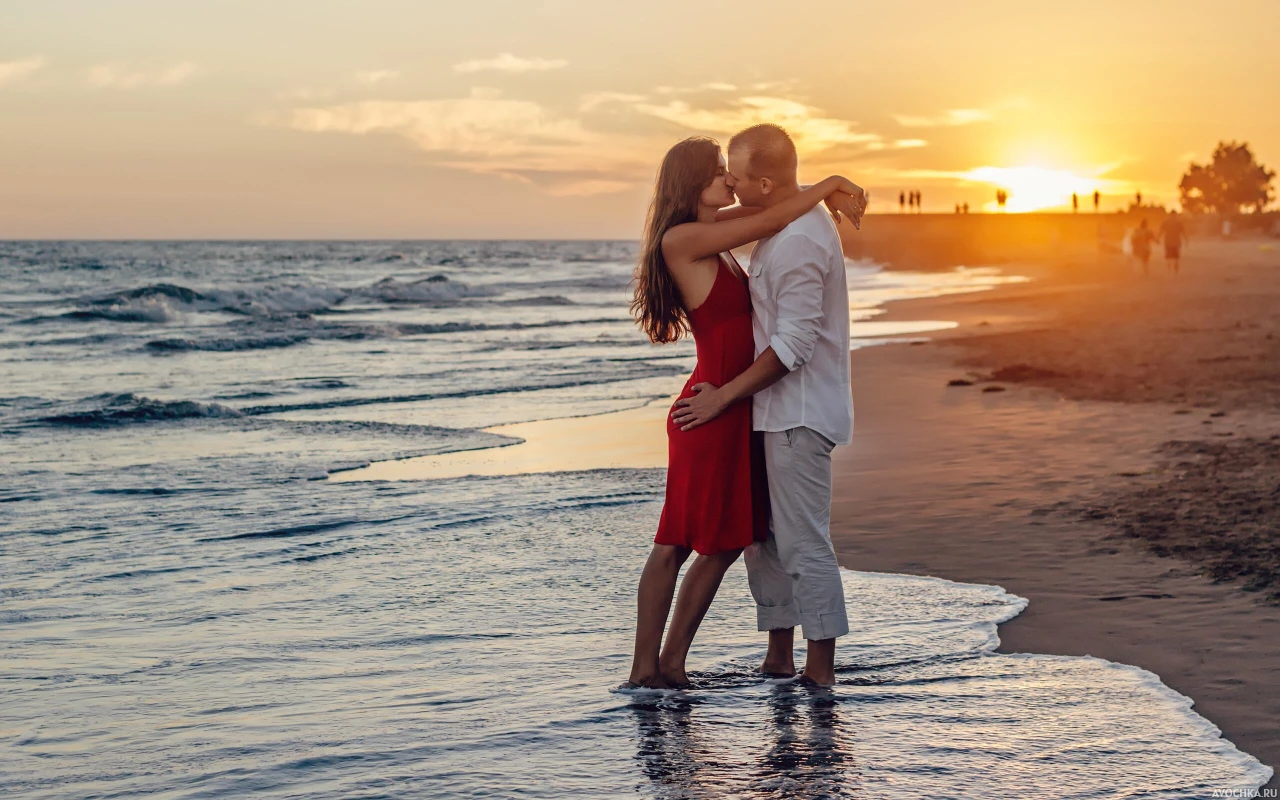 Картинка на тему любви парня и девушки. На фото изображена влюбленная пара, которая стоит в воде на берегу моря. Парень целует и обнимает девушку в красном платье на пляже. Вокруг таится романтическая атмосфера: закат, море, песок. Скачать романтическое фото с парнем и девушкой на аву или рабочий стол.