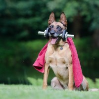 Фото с собакой с гантелей в зубах. На картинке изображен красивый мощный пёс, которому не все равно на свой внешний вид и телосложение. Эта овчарка регулярно занимается спортом и упражняется с гантелей, нося ее в зубах. Скачать фото с собакой с гантелей.