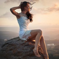 Фото с девушкой в белом платье на вершине горы. На картинке девушка в коротком белом платье сидит на высоте горы, любуясь закатом и прекраснейшим пейзажом. Скачать картинку с девушкой в белом платье.