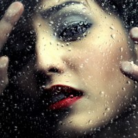 Фото с девушкой за стеклом с каплями воды. На фото девушка с красными губами стоит, прижавшись руками к стеклу с множеством капелек воды. Скачать картинку с девушкой за стеклом на аватарку в контакте.