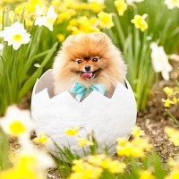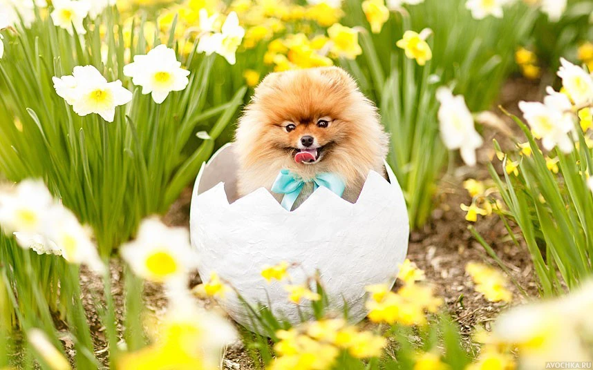 Прикольная картинка с померанским шпицем. Яркая летняя картинка, на которой изображен забавный померанский шпиц, сидящий в расколотом яйце среди травы. Вокруг это милое чудо окружают красивые белые цветы и прочая природная растительность. Скачать картинку с прикольным померанским шпицем.