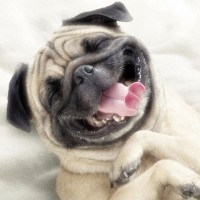 Прикольное фото с мопсом на аву. На картинке изображен смешной мопс с кривляющейся мордочкой. Собака, закрыв глаза и открыв рот с высунутым языком иммитирует улыбку и это выглядит довольно забавно. Скачать прикольную картинку с мопсом на аву или рабочий стол.
