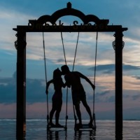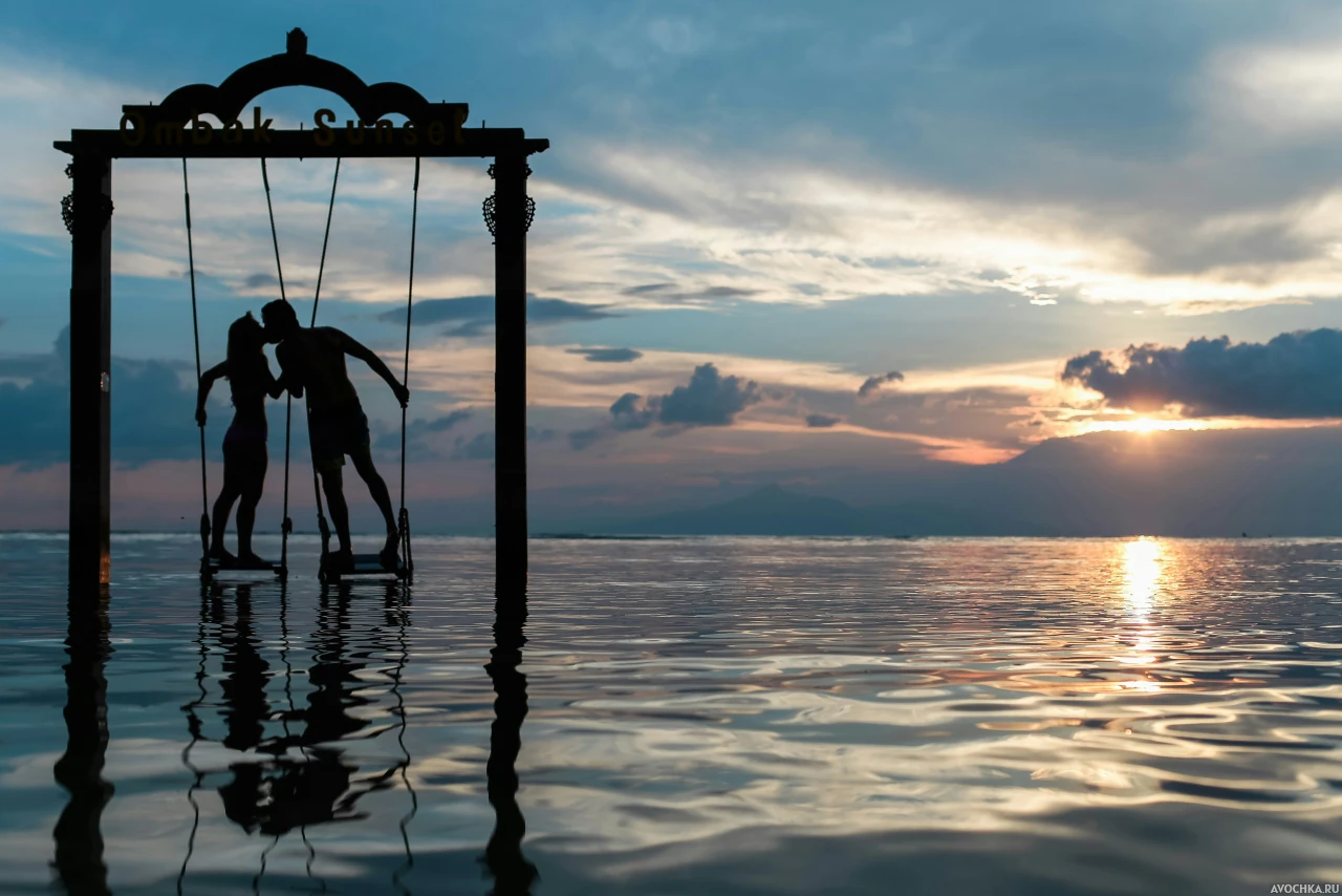 Силуэт влюбленной пары на качелях на воде. На картинке парень и девушка стоят на качелях на море и целуются, взявшись за руки. Скачать романтическое фото на тему любви парня и девушки.