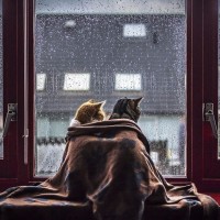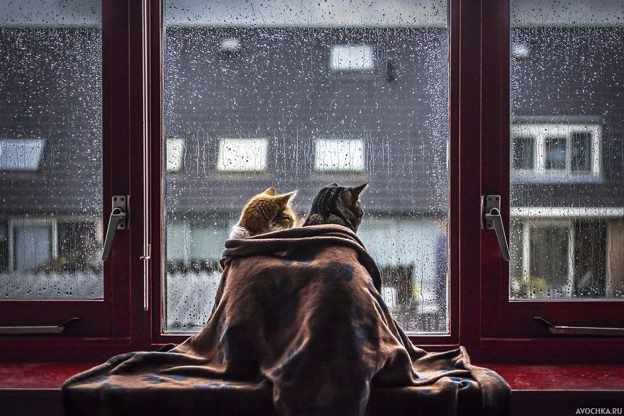 Фото с влюбленными котиками. Даже у животных иногда возникают нежные чувства по отношению друг к другу. На фото изображена милая влюбленная пара кошки и кота, которые сидят, укрывшись пледом, на подоконнике и смотрят как за окном идет дождь. Скачать фото с влюбленными котиками на аву в контакте или на рабочий стол.