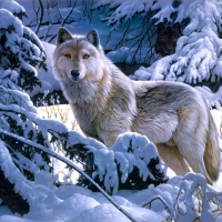 Красивое фото с волком в зимнем лесу. На фото изображен красивый волк, грациозно стоящий в лесу среди деревьев, покрытых снегом. Скачать фото с волком в снежном лесу на аватарку в контакте.