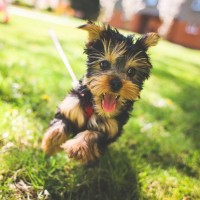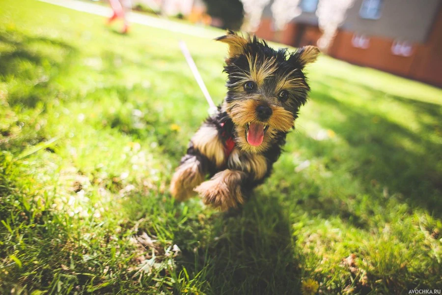 Картинка с жизнерадостным псом йорком. На фото замечательный пёс популярной породы йоркширский терьер на прогулке. Собачка жизнерадостно бежит по траве и наслаждается летней солнечной погодой. Скачать фото с йоркширском терьером на прогулке.