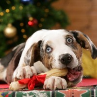 Новогоднее фото с собакой под елкой. На фото счастливый пёс лежит возле праздничной елки и грызет новогоднюю кость. украшенную красной ленточкой. Скачать новогоднюю картинку с собакой с праздничной костью.