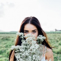 Картинка с девушкой с длинными волосами в поле с цветами. На фото длинноволосая девушка стоит в поле, прикрывшись белыми полевыми цветами. Скачать картинку с девушкой с полевыми цветами.