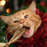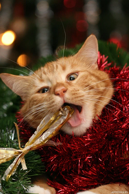 Фото с новогодним котенком в мишуре. На картинке рыжий котенок сидит, укутанный в красную мишуру возле новогодней елки. Скачать праздничную картинку на тему нового года с рыжим котенком.