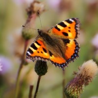 Фото с бабочкой, сидящей на репейнике. На картинке изображена рыжая бабочка с черными пятнышками, сидящая на репейнике. Скачать фото с рыжей бабочкой на аву в контакте.