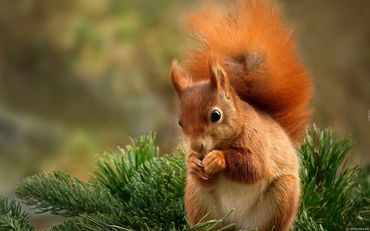 Фото с белкой, грызущей орешек. На картинке изображена белка, которая сидит на еловой ветке и держит в лапах орешек. Белки - прикольные, шустрые и запасливые животные, у которых всегда есть что пожевать. Скачать фото с белкой, сидящей на еловой ветке на рабочий стол.
