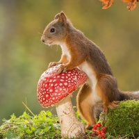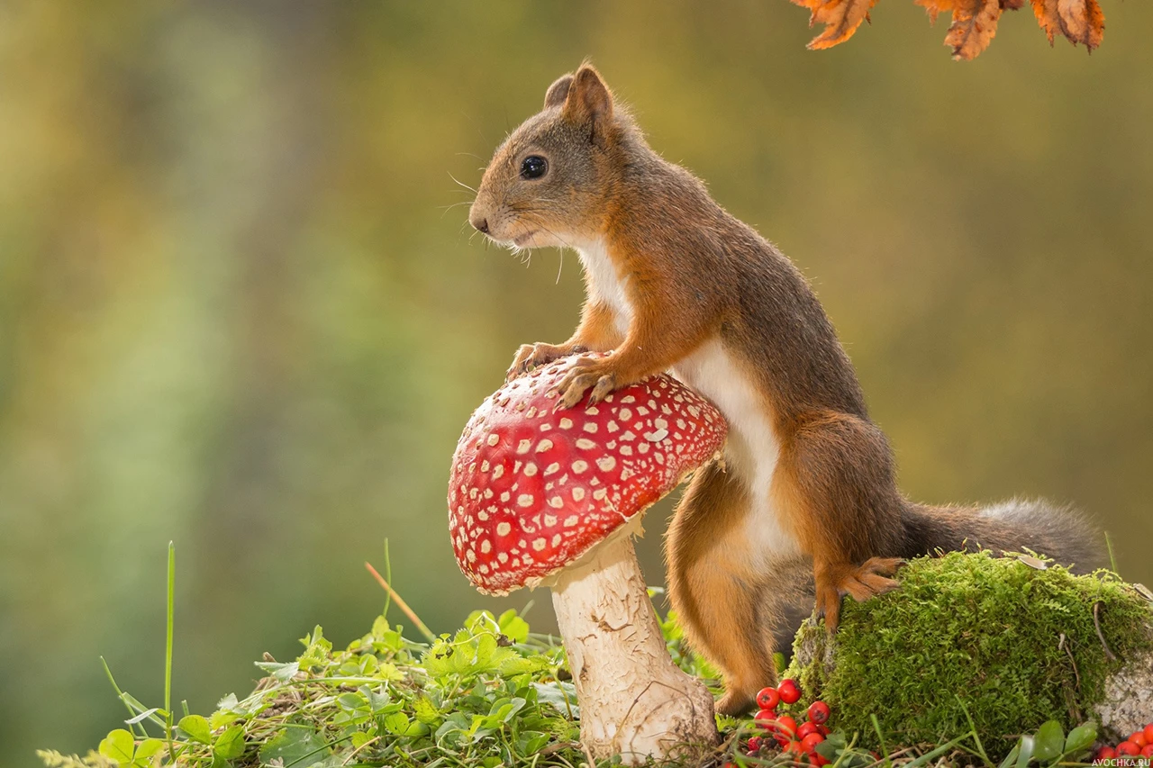 Картинка с белкой, стоящей рядом с мухомором. На картинке забавная белочка, которая стоит на траве на природе, держась лапками за мухомор. Скачать картинку с белкой возле мухомора на аватарку можно ниже на этом сайте, кликнув на кнопку "скачать аватар".