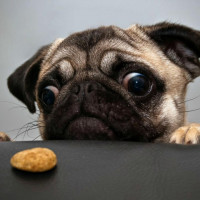 Фото с прикольным мопсом, который увидел печеньку. На фото изображен пёс породы мопс, который неожиданно увидел вкусняшку. Это голодный взгляд и секунды раздумий "взять или не взять вкусняшку" говорит сам за себя. Скачать забавную аватарку с голодным взглядом мопса.