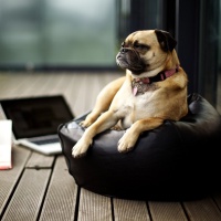 Картинка с важным мопсом рядом с ноутбуком. Забавная картинка с мопсом, который сидит на своем кожаном месте, а рядом стоит ноутбук и книга. Пёс с деловым видом смотрит вдаль комнаты и ожидает когда ему принесут кофе. Скачать забавную картинку с мопсом на рабочий стол.