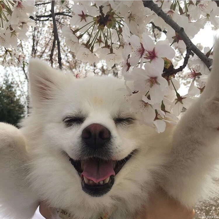Картинка с жизнерадостной собакой. На картинке изображен очаровательный белый пёс, который очень рад прогулке. Пёс, который находит положительные моменты во всем. Он радуется весне, распускающимся цветочкам и деревьям. Скачать фото с жизнерадостной собакой на аву, чтобы заразиться ее бесконечным позитивом.
