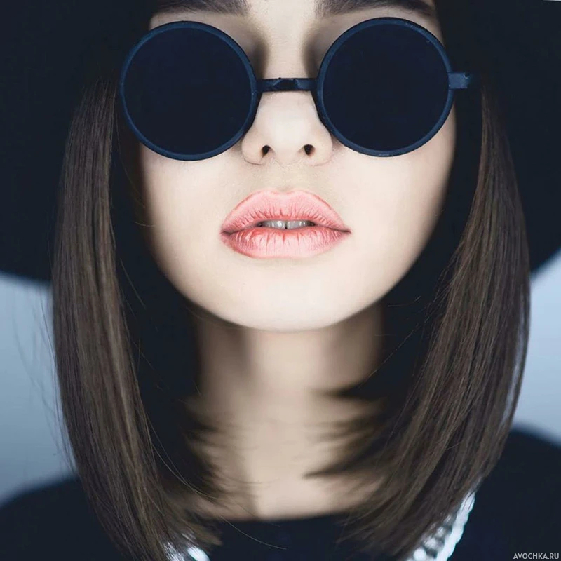 Фото с девушкой в круглых очках. На картинке изображена девушка с темными волосами в круглых черных очках. У девушки красивые пухлые губы, накрашенные розовой помадой. Фото с девушкой в круглых очках можно скачать на аватарку в контакте.