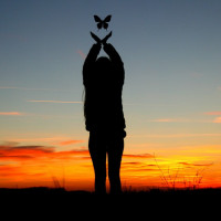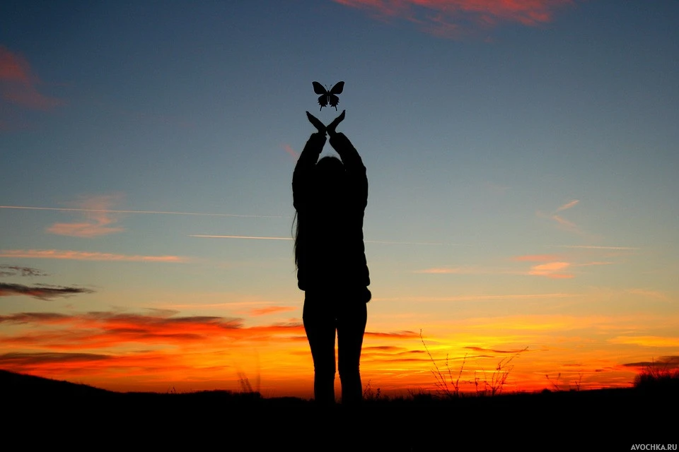 Силуэт с девушкой на закате с бабочкой. На картинке красивый силуэт с изображением девушки, которая выпустила из рук бабочку. Девушка стоит подняв руки вверх, отпуская бабочку на волю. Скачать красивую картинку с силуэтом девушки и бабочки.