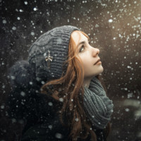 Фото с красивой девушкой в шапке с шарфом. На фото изображена красивая девушка шатенка, укутанная в теплый шарф. Девушка смотрит в ночное небо и наблюдает за падающими снежинками. Скачать фото с красивой девушкой на аву.